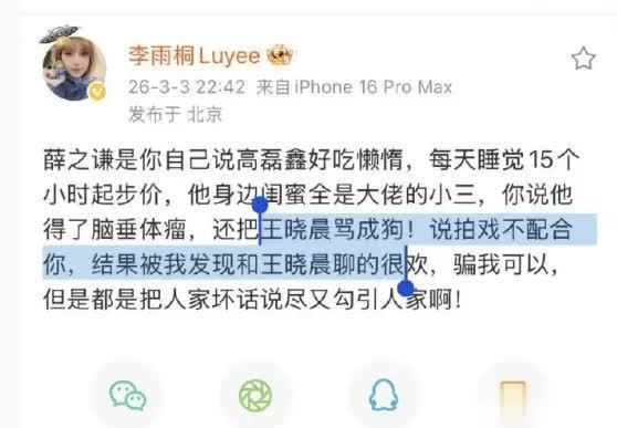 2026年3月3日,李雨桐在微博爆料中指控薛之谦私下贬低王晓晨,却又主动示好,引发热议!